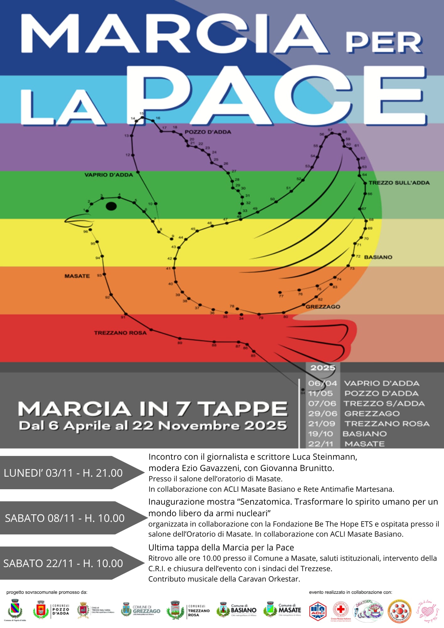 Sabato 22 Novembre ultimo appuntamento con la Marcia per la Pace, l'importante evento sovracomunale che unisce cittadini, istituzioni e associazioni in un percorso di riflessione e sensibilizzazione sui valori della pace e della cooperazione internazionale.