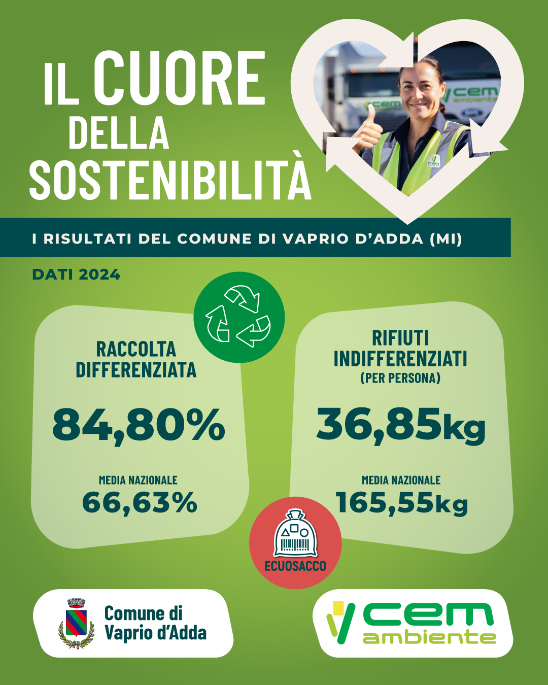 Condividiamo con la cittadinanza i dati 2024 della raccolta rifiuti del nostro Comune, che Cem Ambiente ci ha comunicato.